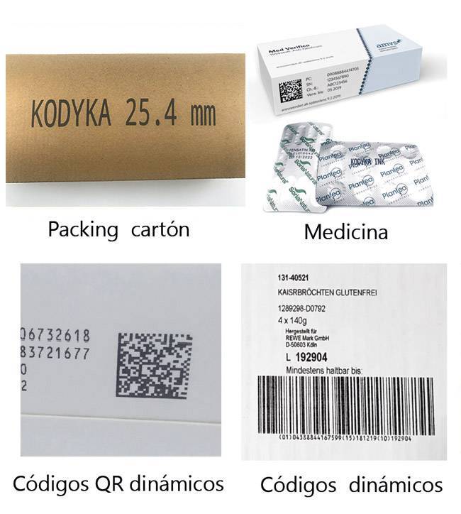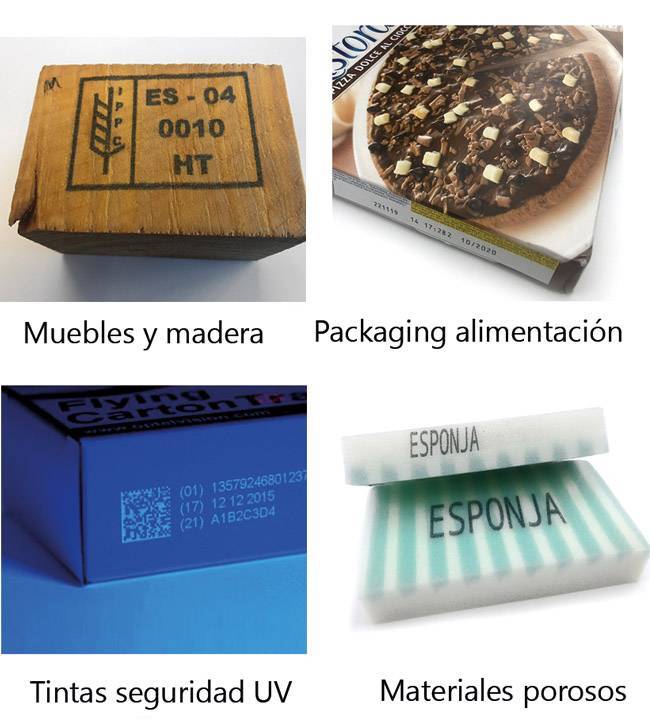 | Sustratos imprimibles | Cartón, plástico, metal, cables, componentes electrónicos, piezas de automóvil, envases de productos químicos industriales, productos farmacéuticos y más |